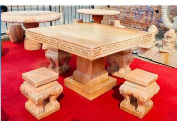 天然石材晚霞紅雕刻方形石桌石凳