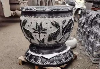中式別墅石灰浮雕荷花圓形花盆水缸