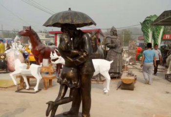銅雕傘情侶接吻雕塑,在景區擁抱浪漫