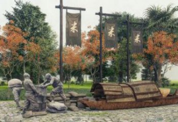 采用銅雕這一經典材質,利用銅的質感與耐久性,塑造出富有歷史厚重感的景觀雕塑。銅雕的古樸色澤,能自然融入戶外環境,經歲月沉淀更具韻味,成為公園等場所中持久的文化符號,以雕塑小品的形式,為景觀增添人文深度。精準復刻傳統市井商貿場景,從人物服飾(長袍、傳統發髻 )到交易道具(布匹、長桌 ),細致展現舊時風貌。商人的長辮、婦人的寬袖衣衫,還原特定歷史時期的著裝特征,讓觀者直觀感受往昔生活片段,喚醒對傳統商貿文化的記憶,成為民俗文化傳播的生動載體。作為景觀雕塑,與周邊自然環境(草地、樹木 )呼應。人物、道具的布局,既形成獨立觀賞焦點,又與綠意背景和諧共存,成為公園景觀中文化與自然融合的節點,供游客駐足、觀賞、聯想,提升公共空間的文化體驗與藝術氛圍,使雕塑小品成為激活景觀活力、講述文化故事的媒介。